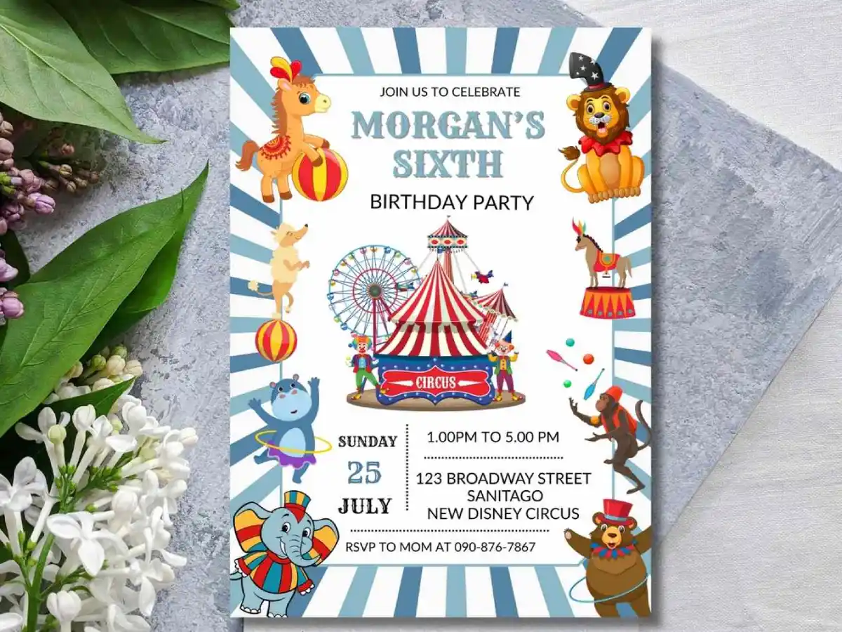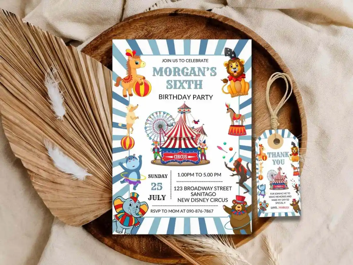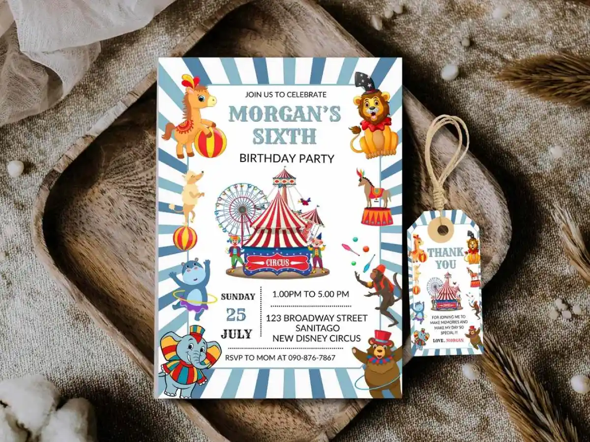 Set the stage for a show-stopping celebration with this circus-themed editable birthday invitation. Bursting with big-top charm and playful carnival flair, this design is perfect for little partygoers who love color, fun, and a touch of magic. Easily personalize all the party details, then print or send digitally for an invitation that promises a birthday celebration worthy of the spotlight.