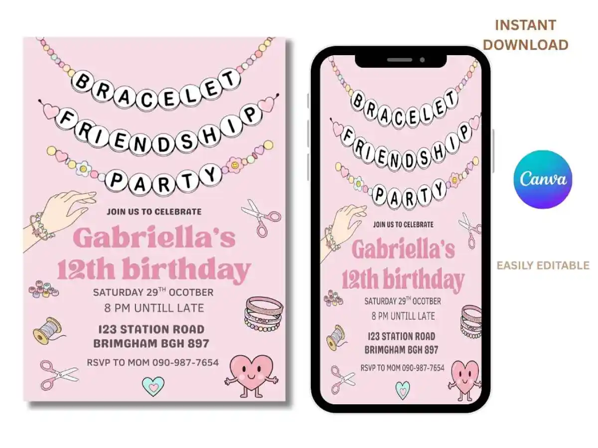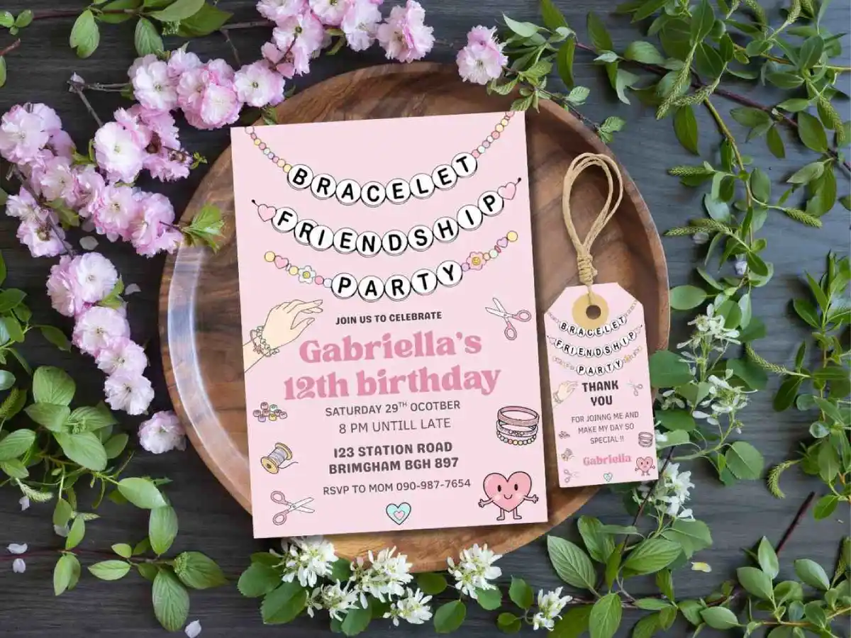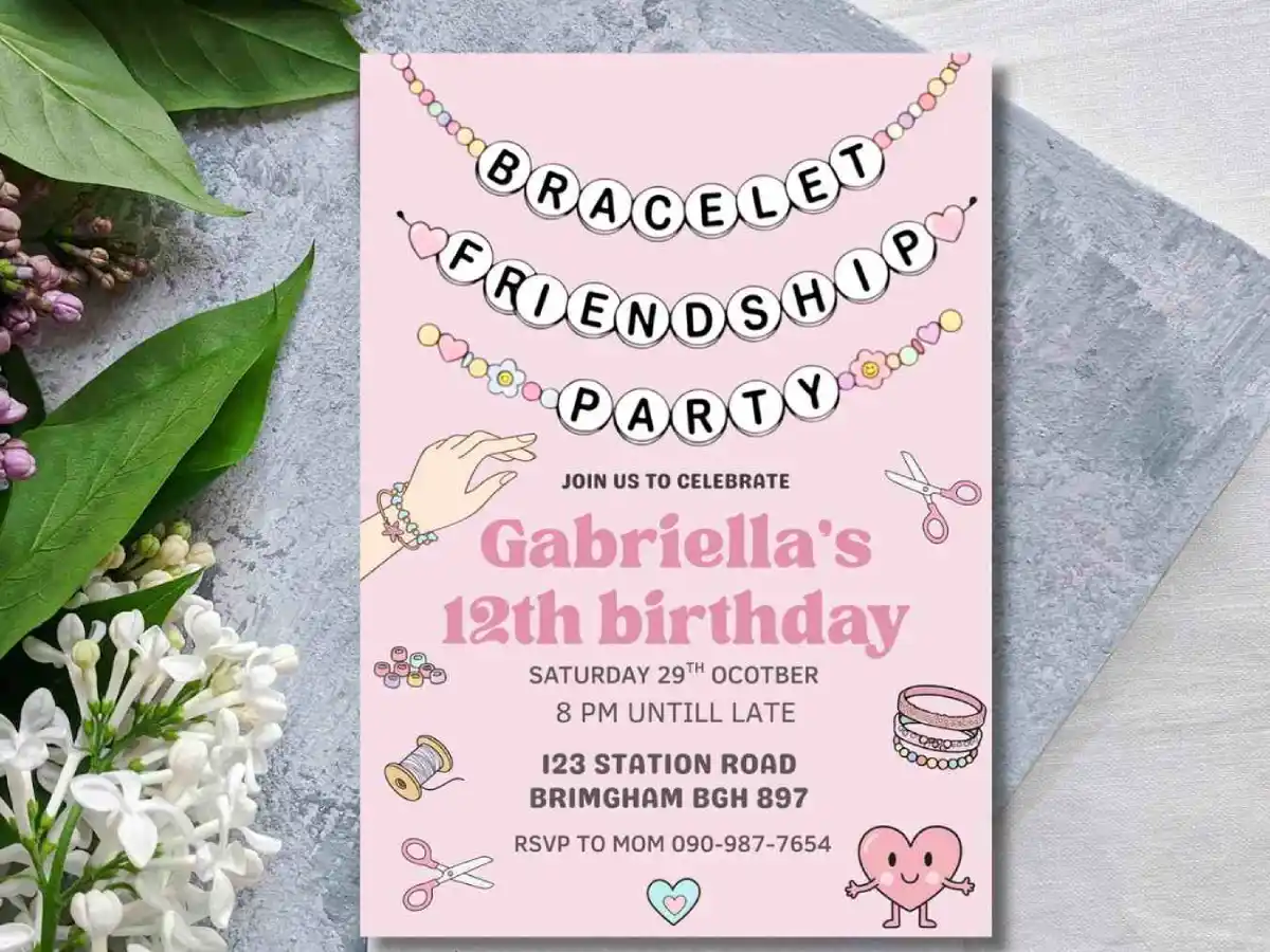 Girl’s Friendship Bracelet Birthday Party Invitation , Pink Girls Birthday Party Invite