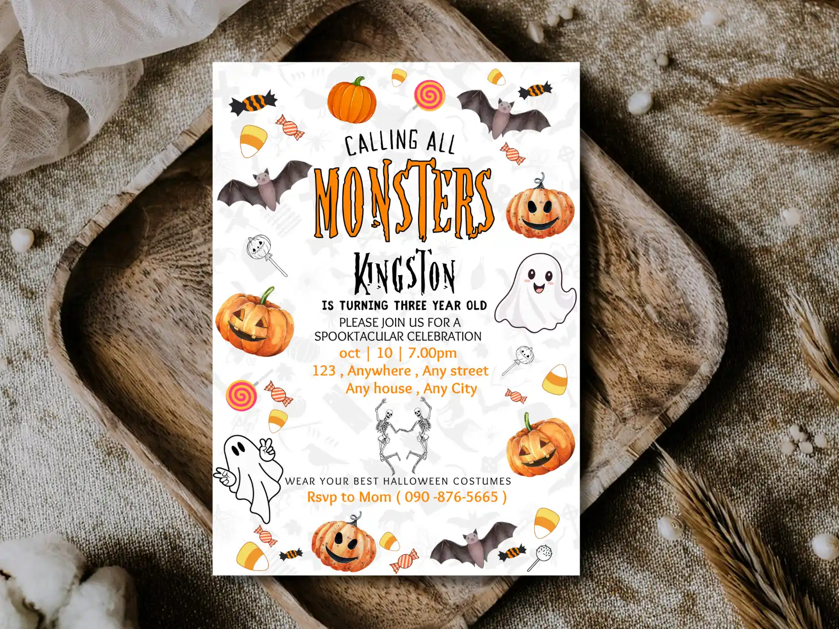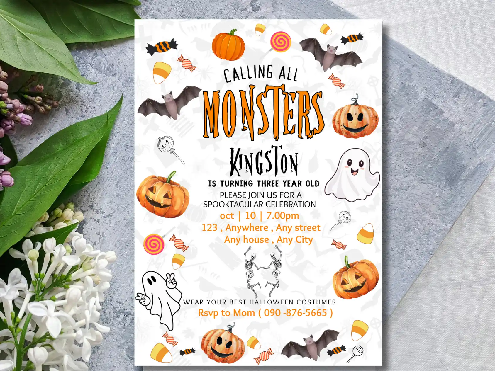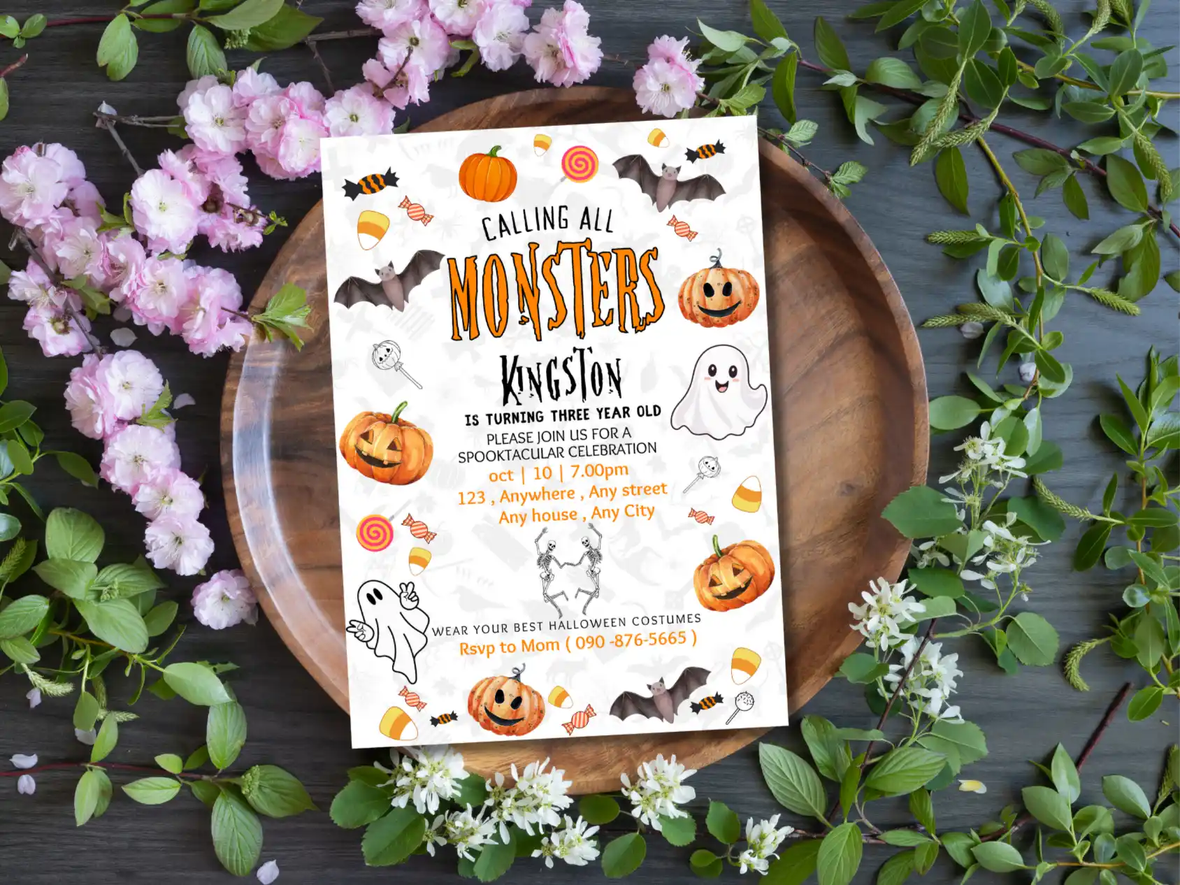 If You Are Planning To Host A Birthday Party Especially Halloween Theme Party This Designed Is Perfect For Your Party Invitation. A Cute Pumpkin, Bats. Monster, Halloween Candy, Dancing Skelton And Monster Background with Funny Fonts Add An Extra Fun In The Design That Look So cute. Make Your Halloween Party More Memorable With This Invite And Make Your Family Members And Friends More Craziest.