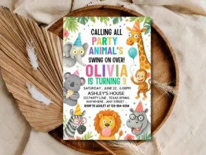 This Jungle Party Animals Theme Design Look So Cute With Different Jungle Party Animals With Birthday Hats Balloons , A Colourful Vibrant Text Style Add More Charm in Design , So If You Are Planing A roaring Birthday Bash To Your Kid. This Invitation will Be Amazing . This Design Is Especially Designed For Jungle Party Animals Theme Lovers . So Add More fun in Your Event with This Colorful Invite And Feel Your Friends And Family Members More Special . Make Your Day More Memorable.