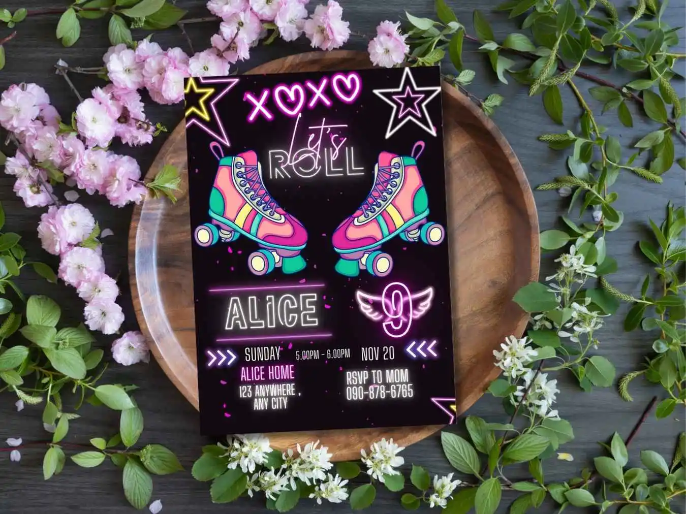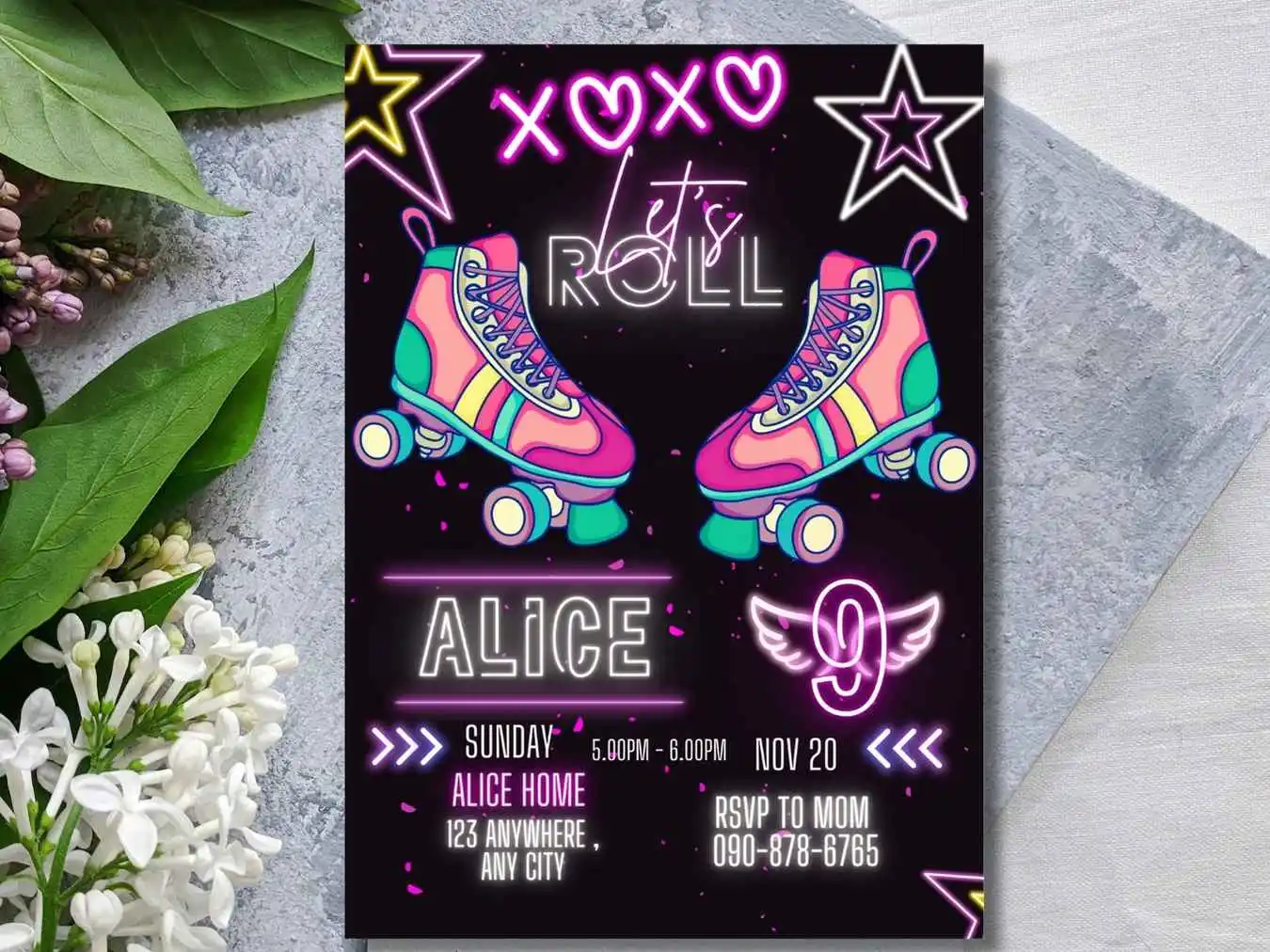 Roller Skating Birthday Invitation For Girls , Roller Skating Neon Glow 9TH Girls Skate Party Invitation