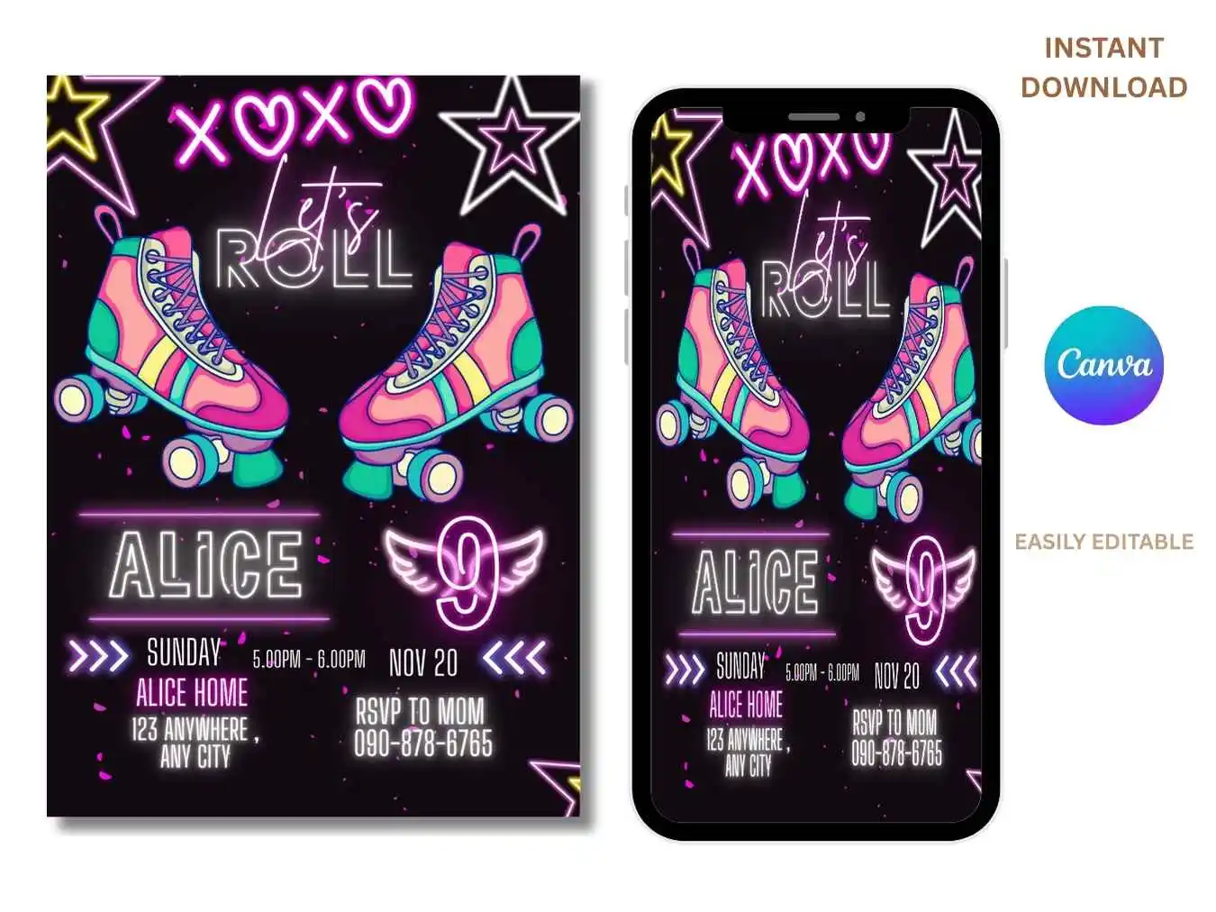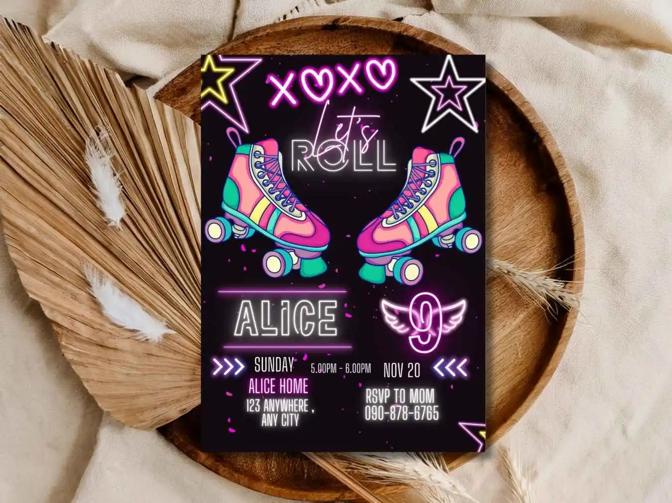 Roller Skating Birthday Invitation Design Is Perfect For Girls Skating Parties And Teen Celebrations Neon Lights Fun Retro Vibes And Font Add More Glow In Your Party , Pink And Black Colour Theme With With Neon Effect Look So Gorgeous And Easily Attract Your Guest . So Make Your Little One’s Day More special With This Roller Skating Invitation.