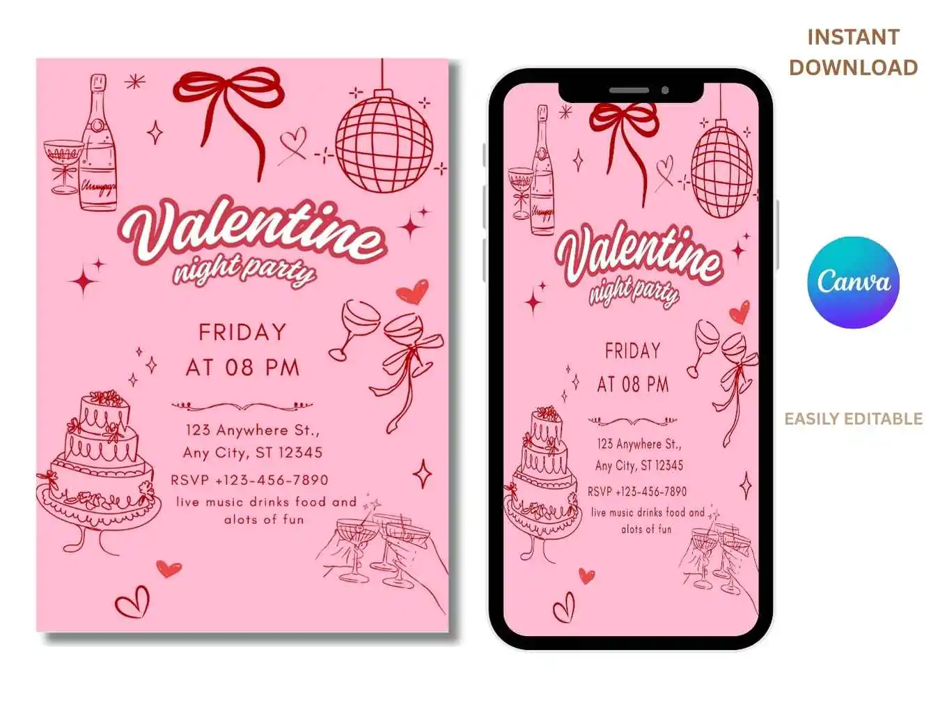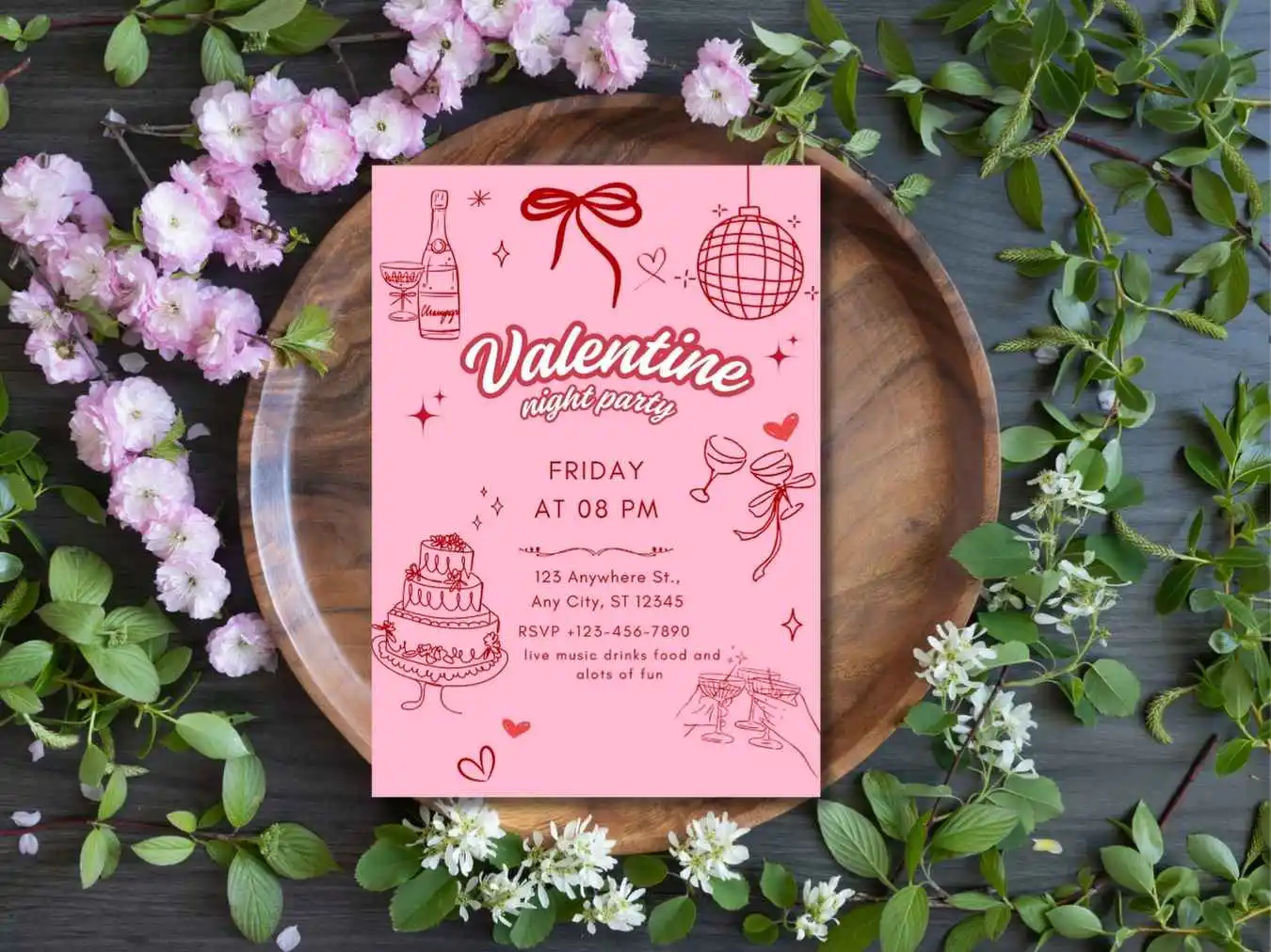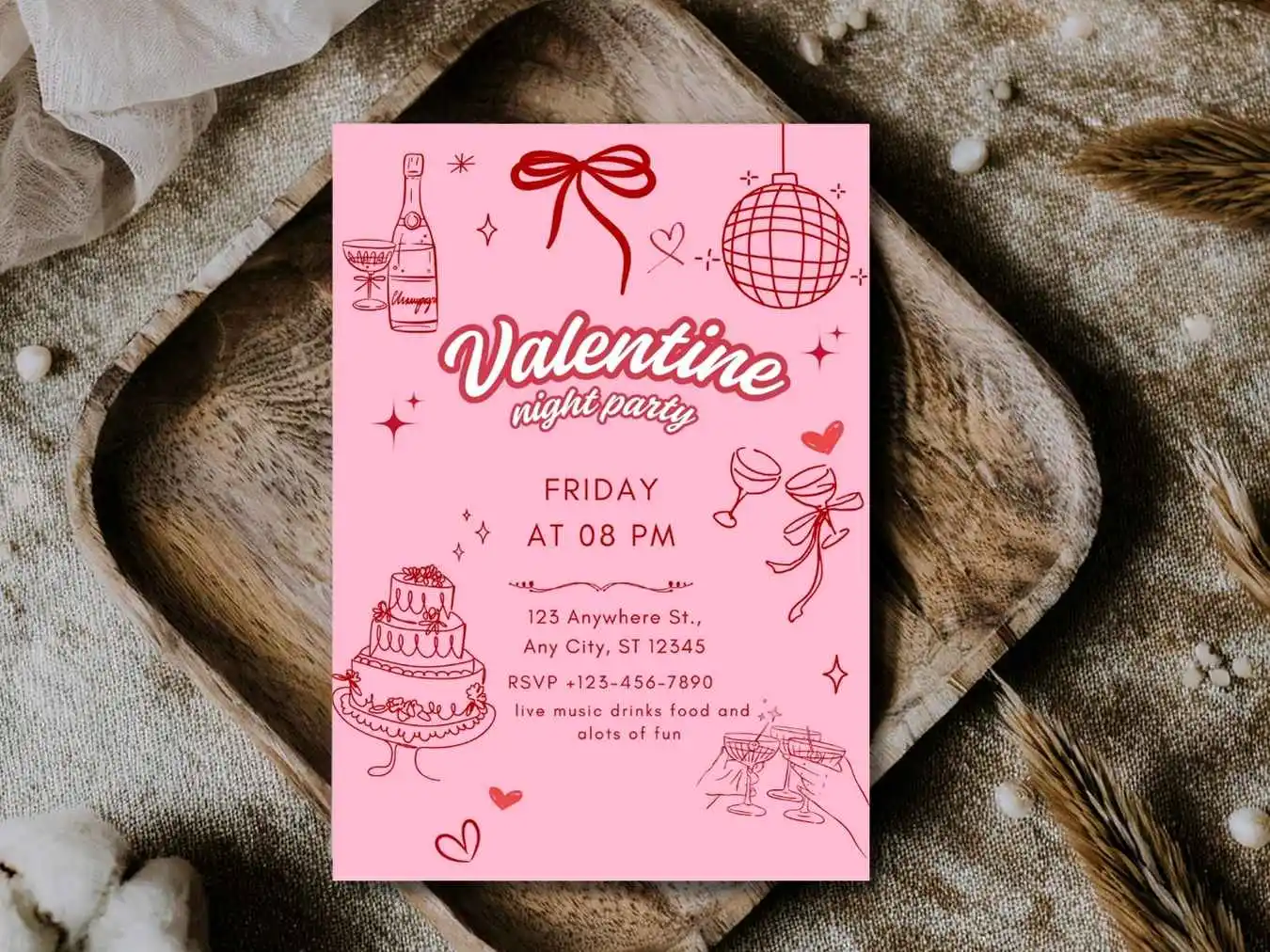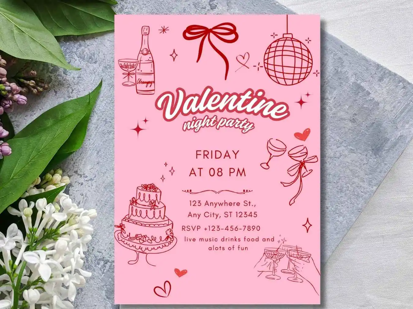This Beautiful Valentine / Galantine’s Day Girls Party Invitation Is Perfect For Celebrating Friendship And Love. Especially Design For Girls’ Night parties, Pink Themes, And Fun-filled Valentine Celebrations. Ideal For Sharing Digitally or Printing For A Stylish and memorable invite. Make Your Party More Fantastic And Adorable With This Simple Cute Invitation